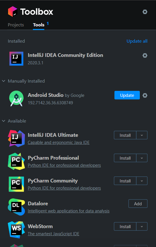 아래와 같이 IntelliJ, PyCharm, Android Studio 등을 설치, 관리 할 수 있다.