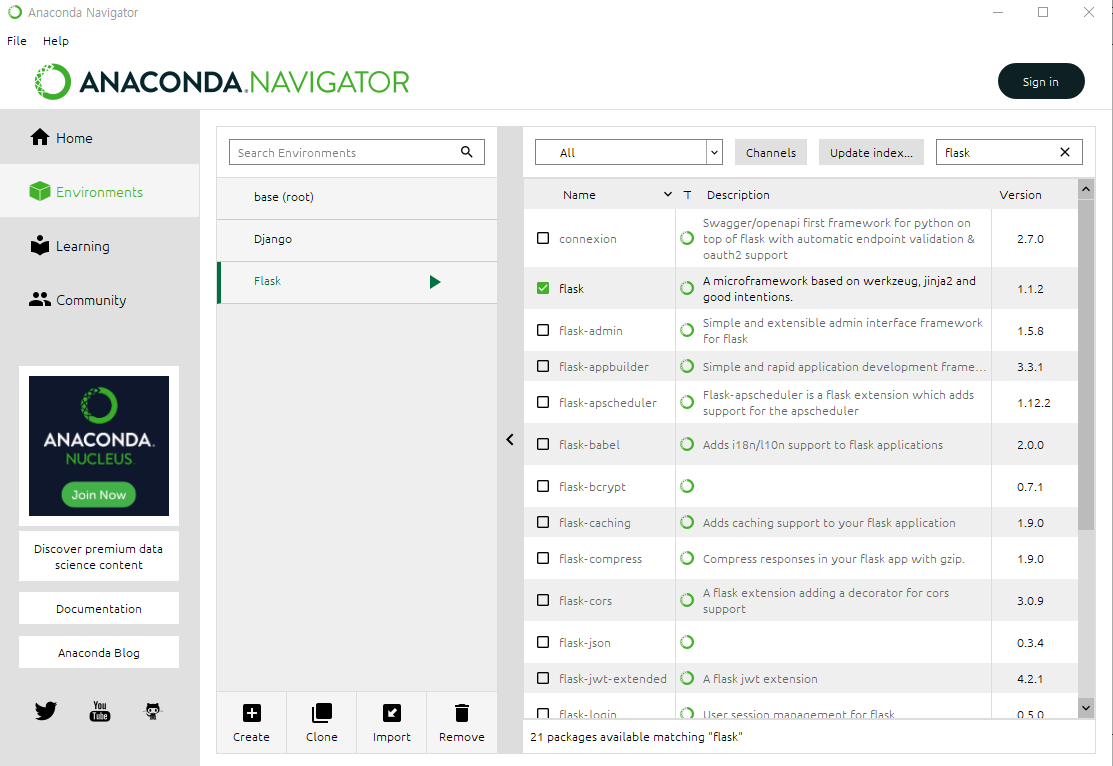 Anaconda Navigator에서 Flask를 설치하고 사용할 가상환경(Flask)을 생성한 후 Flask를 설치해준다.
