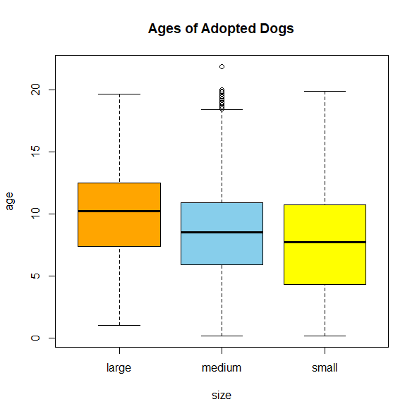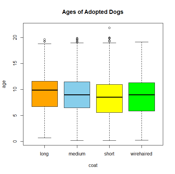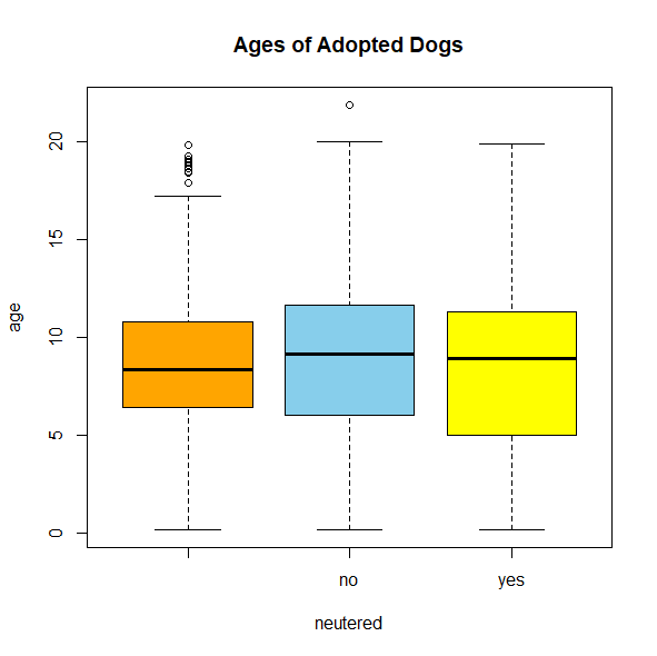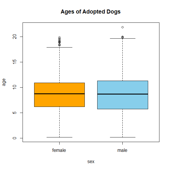 boxplot(age~sex, dogs, main="Ages of Adopted Dogs", ylab="age", col=c("orange", "skyblue"))