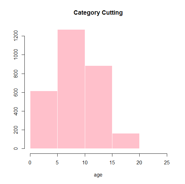 hist(dogs$age, main="Category Cutting", xlab="age", ylab="", col="pink", border="white", breaks=4)