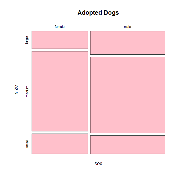 mosaicplot(~ sex + size, dogs, main="Adopted Dogs", color="pink")