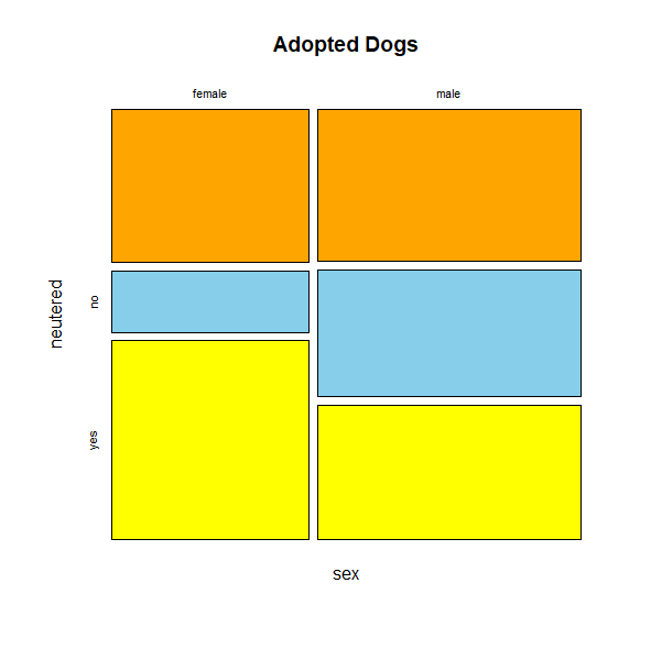 mosaicplot(~ sex + neutered, dogs, main="Adopted Dogs", color=c("orange", "skyblue", "yellow"))