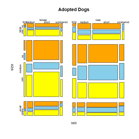 mosaicplot(~ sex + size + coat + neutered, dogs, main="Adopted Dogs", color=c("orange", "skyblue", "yellow"))