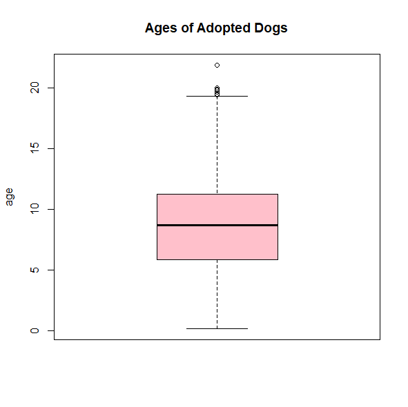 boxplot(dogs$age, main="Ages of Adopted Dogs", ylab="age", col="pink")