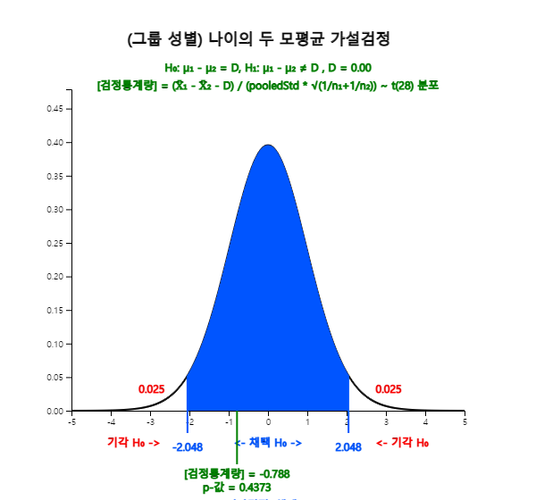 검정통계량이 0에 가깝기 때문에 두 모평균이 같은 확률이 높다.