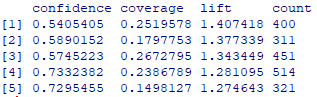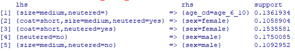 - 리프트(Lift) 기준으로 상위 5개의 규칙들을 살펴볼 수 있다.