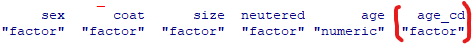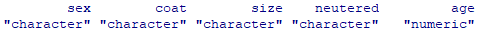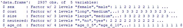 - sex, coat, size, neutered 변수의 form을 character에서 factor로 변경시켜준다.