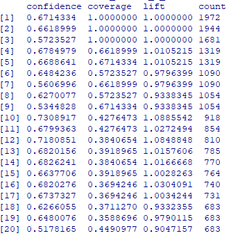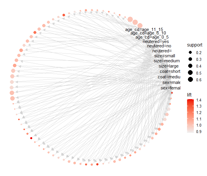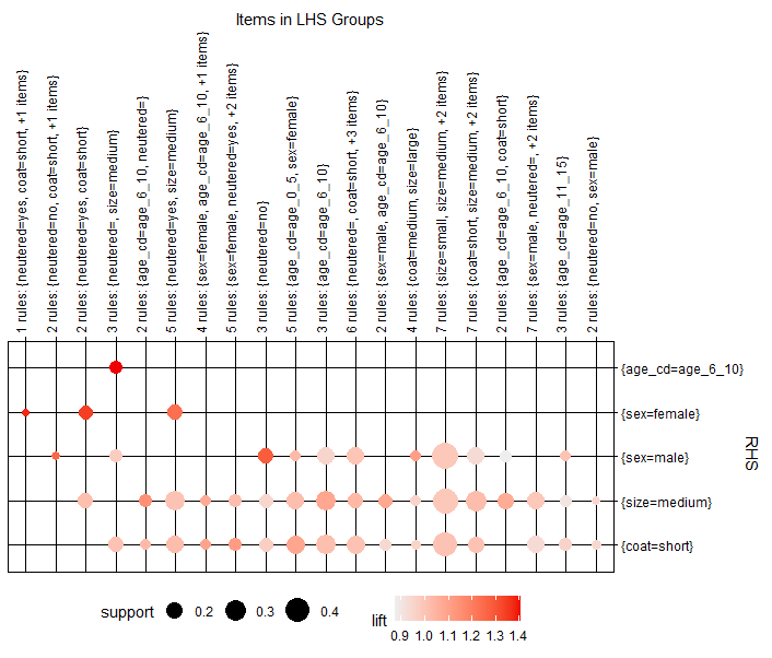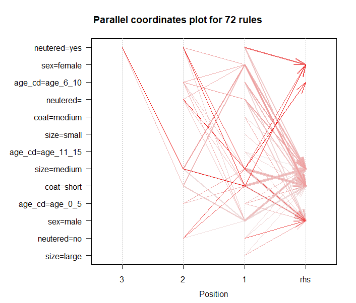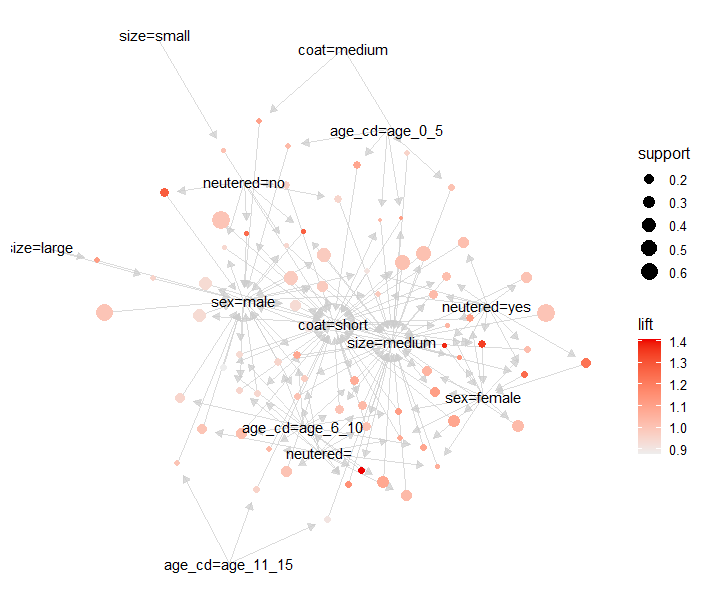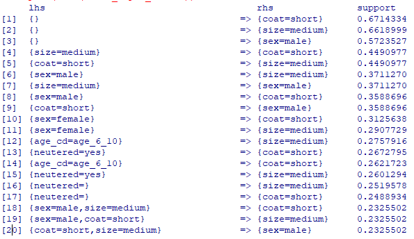 rules_sup10_conf50 <- apriori(cust_dogs_ar_tr, parameter=list(sup=supportLevels[3], conf=confidenceLevels[5], target="rules"))