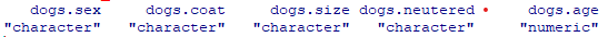 cust_dogs<-setNames(cust_dogs, c("sex", "coat", "size", "neutered", "age"))