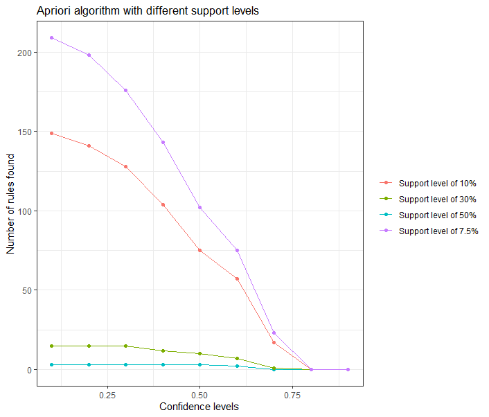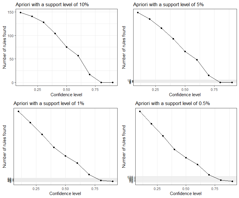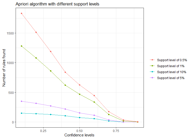 num_rules <- data.frame(rules_sup10, rules_sup5, rules_sup1, rules_sup0.5, confidenceLevels)