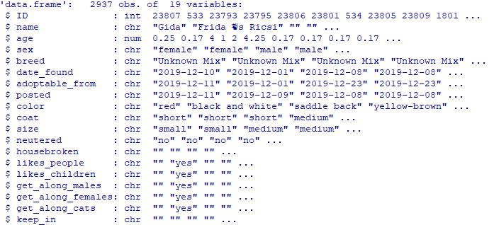 - 2019년 12월 12일 헝가리의 동물 보호소 데이터베이스의 2,937마리의 개에 대한 데이터이다.