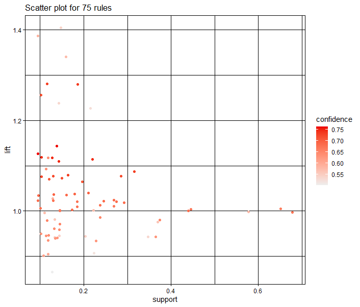 지지도 50%, 30%의 경우 생성되는 규칙이 매우 적으며, 반대로 지지도 7.5%의 경우 생성되는 규칙이 많기때문에, 우리는 지지도 10%를 선택 할 것이며, 최소 50%의 신뢰도를 선택하려한다.