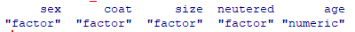cust_dogs<-transform(cust_dogs, sex = as.factor(sex), coat = as.factor(coat), size = as.factor(size), neutered = as.factor(neutered))