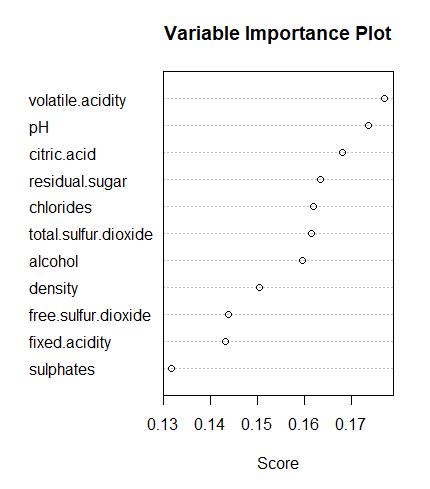 -> volatile.acidity 변수가 분류에 가장 중요한 변수로 사용되었음을 알 수 있다.