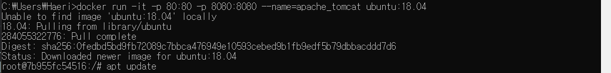 docker run -it -p 80:80 -p 8080:8080 --name=apache_tomcat ubuntu:18.04