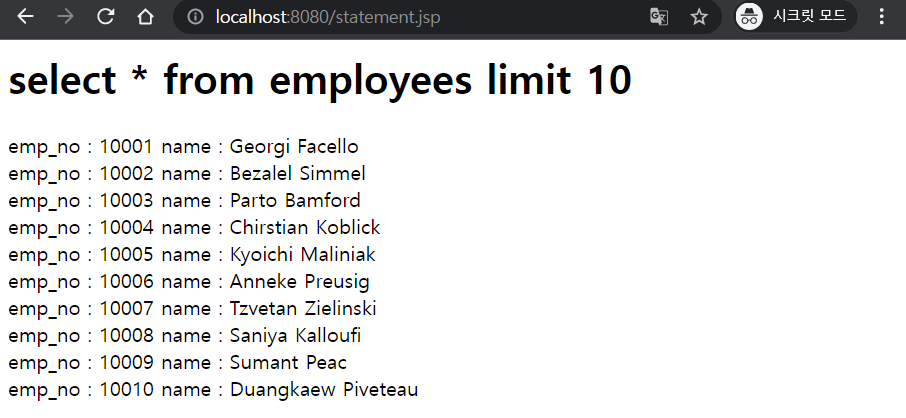 out.println("emp_no : "+rs.getInt("emp_no") +" name : "+ rs.getString("first_name") +" "+ rs.getString("last_name"));