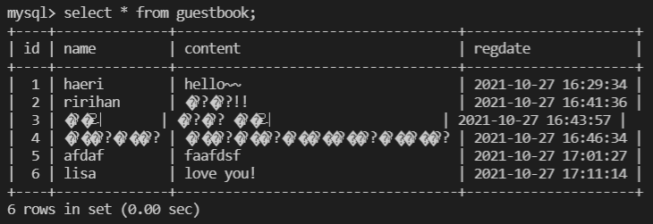 ๐ ํ ์ด๋ธ์ ์์ฑํ ๋ ์บ๋ฆญํฐ ์ ์ค์ ์ ํด์ฃผ์ง ์์์ผ๋ฉด ๋ค์์ ๋ช ๋ น์ด๋ก ์ด๋ฅผ ์ค์ ํด์ค๋ค.