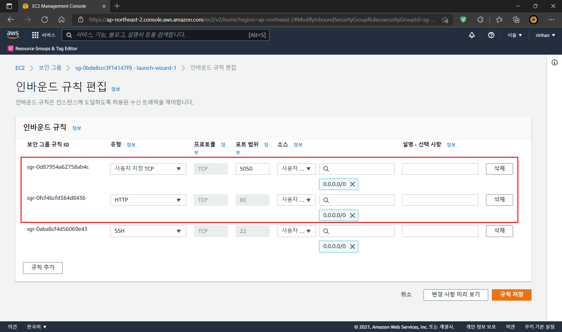 8080포트와 5050포트를 사용하므로 이를 인바운드 규칙에 추가해주어야한다.