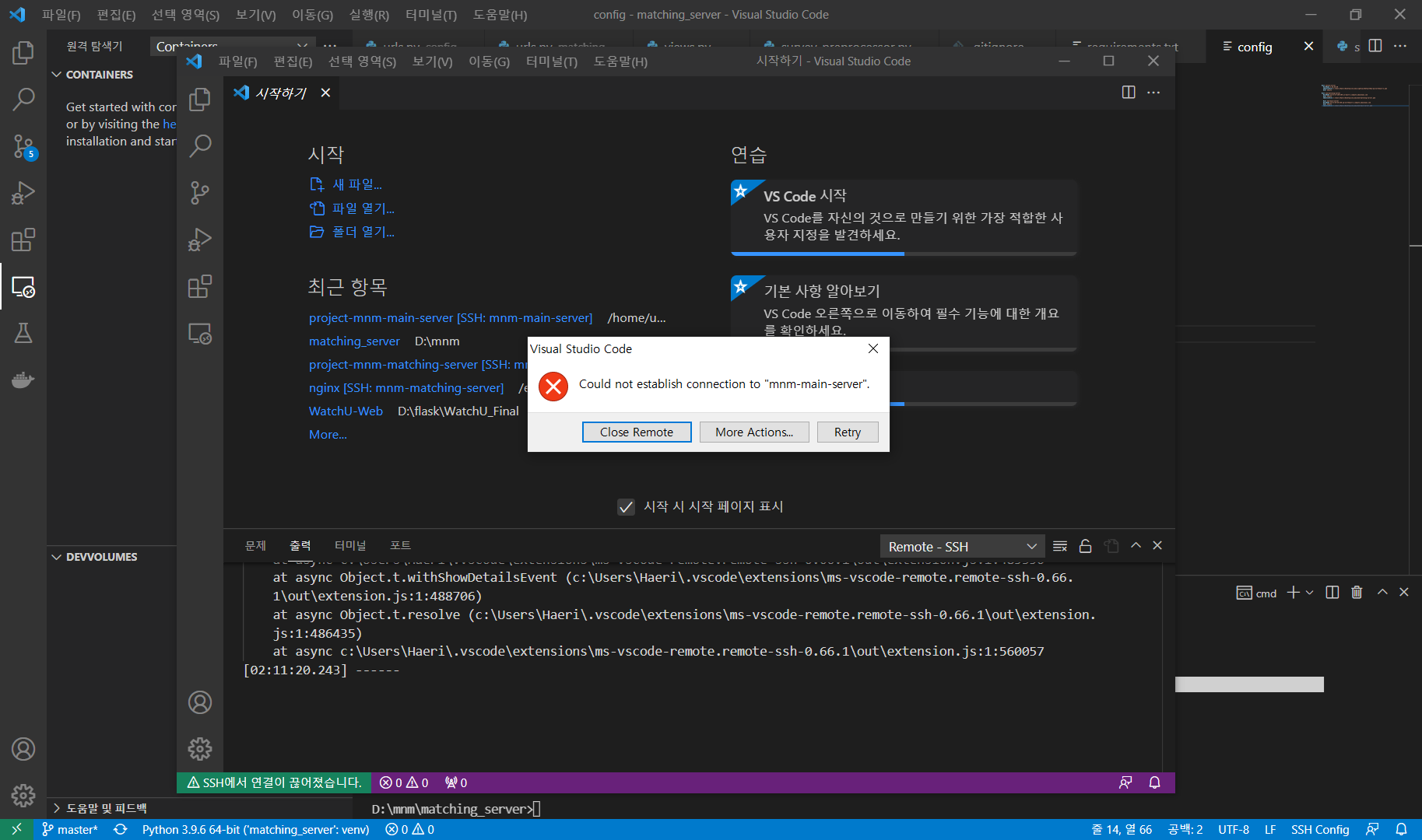 연결이 잘 되다가 VSCode를 종료시켰다가 나중에 다시 같은 서버로 SSH 요청을 수행하였을 때 다음과 같이 에러가 나거나 계속 연결 요청만 들어가고 연결 완료가 안 될 때가 있다.