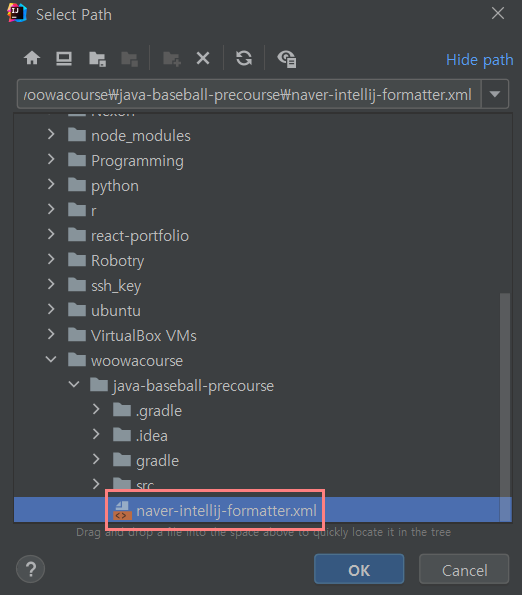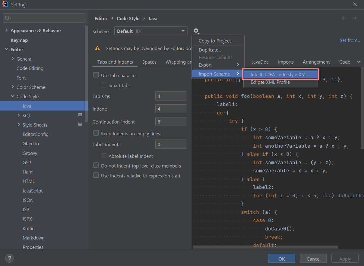 💡 프로젝트 폴더에 해당 파일을 추가시켜줘야하는 줄 알았는데 그냥 아무 곳에나 다운받고 IntelliJ에 한번 적용시키면 이후에도 그냥 setting에서 해당 formatter를 사용한다는 scheme 설정만 추가해주면 된다!!