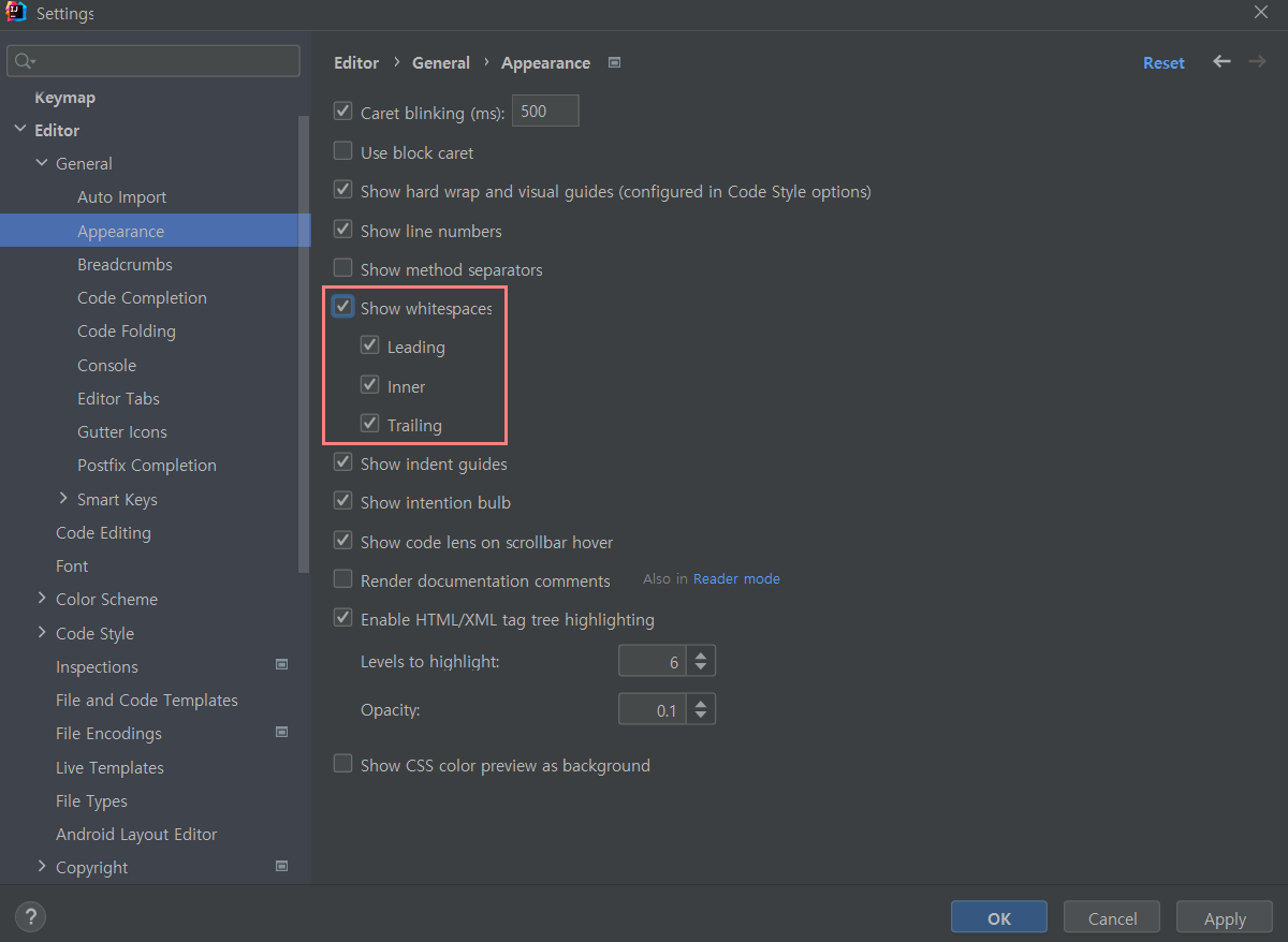 공백 문자 보이기 설정
