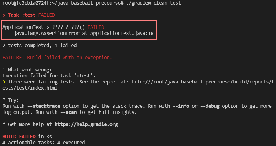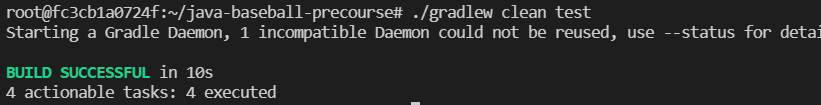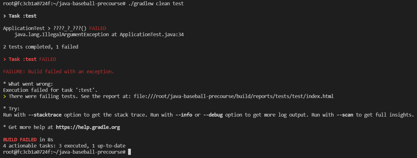root@fc3cb1a0724f:~/java-baseball-precourse# ./gradlew clean test