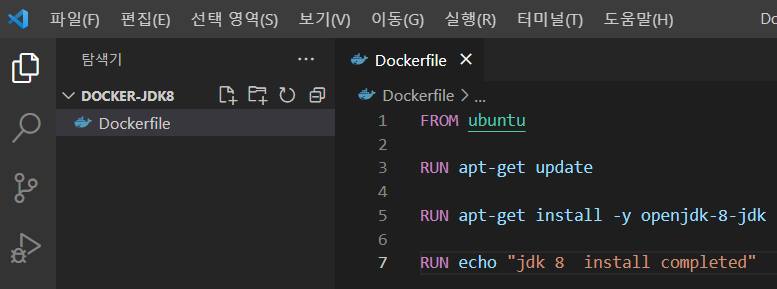 현재 위치의 파일에서 Dockerfile을 읽어서 도커 "ubuntu_jdk8:0.1"이라는 이름의 도커 이미지를 생성한다. (기존에 생성되어 있는 이미지가 있으면 삭제한다.)
