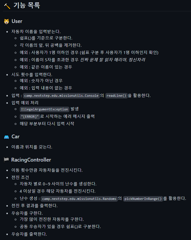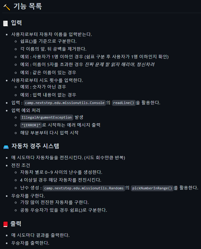 피드백을 반영하여 "2주차 미션: 자동차 경주 게임"의 기능 목록을 수정하였다. 내용적으로 변경된 부분은 거의 없지만 클래스 별로 기능을 분리하던 방식에서 입력, 자동차 경주 시스템, 출력으로 기능을 분리하는 방식으로 변경하였다. 그저 기능 목록을 나열하는 것보다는 이렇게 구분하는 것이 제가 보기에 편해서 이렇게 작성하였다. 보기 편한게 쨩..