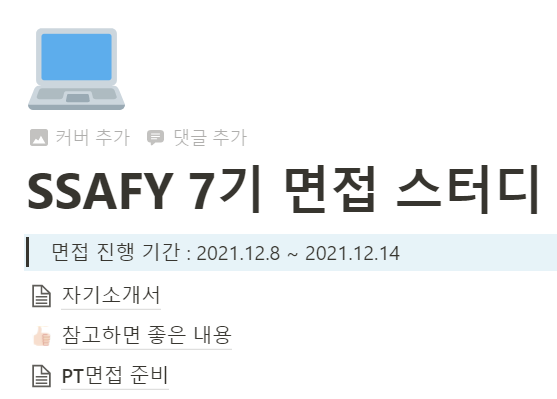 이제 마지막 면접만 남았는데!! 중요한 건 난 지금까지 면접이란걸 본적이 없는 사람이란거다.. 그나마 고등학교 때 동아리 면접 정도..ㅎ 당시 싸피를 지원한 사람들이 모여있는 오픈 카톡방에 들어가있었는데 대부분 면접 스터디에 참여하는 것 같아 나도 처음으로 스터디라는 것을 해보았다. 결과적으로 면접에서 탈락하기는 했지만 면접 스터디는 꽤 좋은 경험이었다고 생각한다. 공통 관심사가 있는 사람들과 대화를 나누다보니 얻어가는 정보도 많았고 재미도 있었다. 그리고 이런 스터디에 대한 무서움?이 없어졌다는게 굉장히 도움이 되었다. 나중에는 코딩테스트 스터디를 좀 알아보면 좋을것 같다.