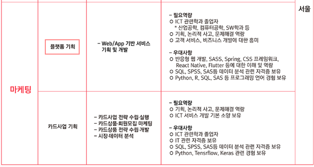 재밌는게 나는 이 인턴 채용에 마케팅 쪽의 플랫폼 기획 직무에 지원하였다. 왜 갑자기 개발 직무가 아닌 기획 직무로 지원을 했는지 궁금할 수 있는데 솔직히 다른 이유는 없었고 코딩 테스트가 Java로만 진행된다기에 내가 그 동안 Python으로만 코테를 준비했어서 코테를 안보는 기획 직무로 지원을 했던 것이었다. (집에서 회사가 가깝기도하고.. 블랙핑크 카드가 있기도하고.. 여튼 가고 싶었다^^)