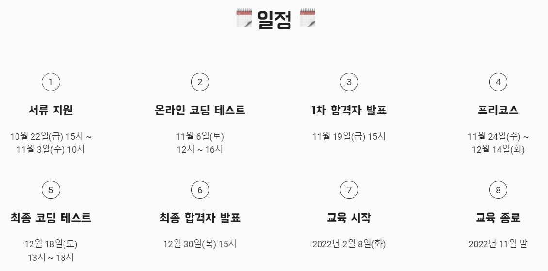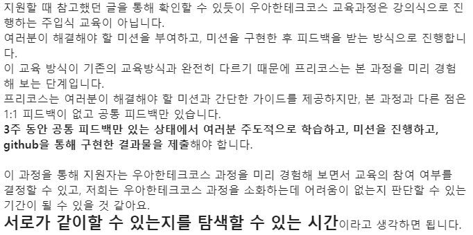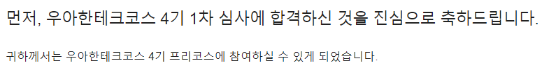 그리고 선발 과정이 너무 길다고 지원을 포기하지 않았으면 좋겠다. 1차 합격만 되면 3주간 "프리코스"라는 이름의 미션 과정이 진행되는 데 이때 배우는게 정말 많다고 생각한다.
