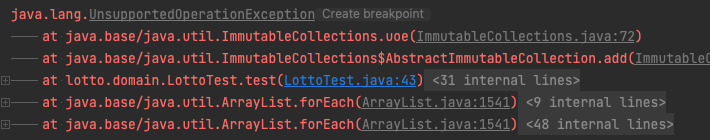로또미션의 Lotto 클래스에서 Lotto의 모든 값을 정수형 리스트로 반환하는 메서드를 이용해 받아온 리스트를 "final"로 선언해도 해당 리스트는 다음과 같이 그 내용이 수정될 수 있다.
